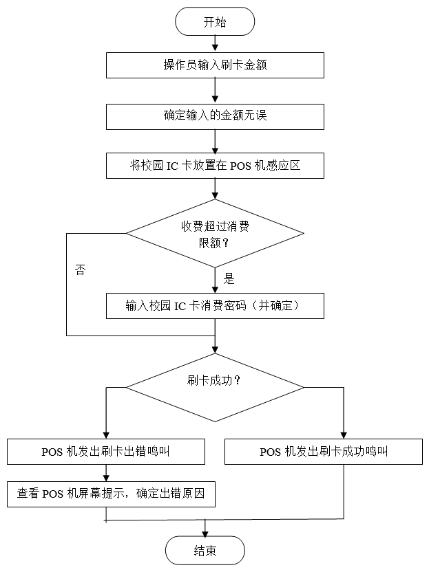 消费结算是指持卡人使用校园卡在校内消费后(食堂就餐、超市购物等),通过POS机刷卡方式进行的支付结算(即付款)。在操作人员输入刷卡金额并确定后,持卡人将校园卡放置在POS机感应区内,POS机发出一声鸣叫后表示刷卡成功,此时可将校园卡收回,完成一次刷卡结算。具体操作参见《POS机刷卡支付操作流程》。